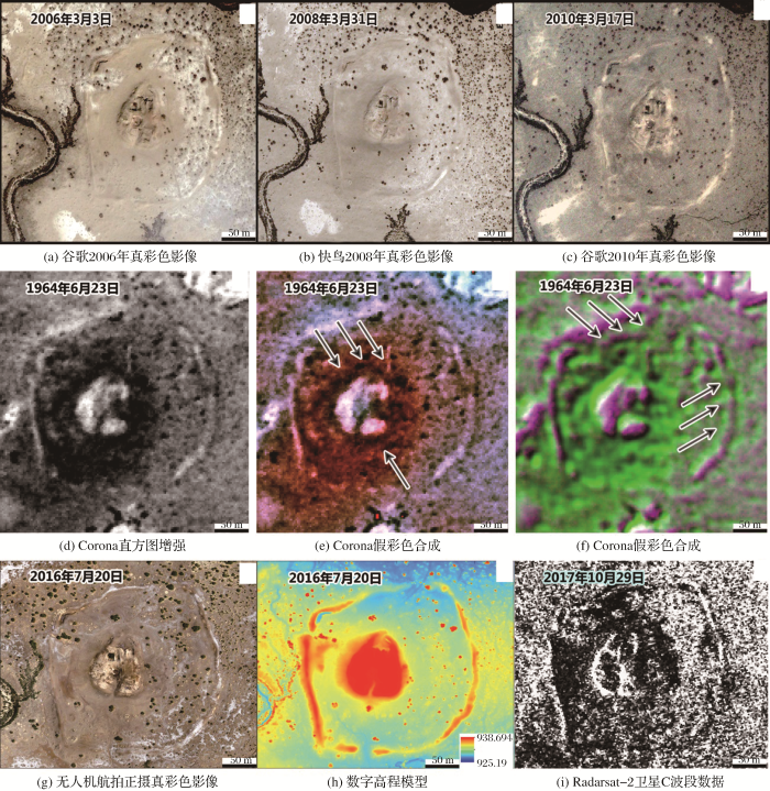 ... 文化衰落或者遗址功能改变之后,遗址被废弃,随着时间的推移,这些遗迹受到风化、侵蚀等破坏,同时与周围的土壤发生着物理和化学的作用,导致遗迹与周围土壤的成土过程存在差异,形成特殊的堆积.通常情况下考古目标具有较规则的几何形状,如壕沟、城墙、宫殿等,通过分析多源影像的光谱、纹理和结构特征可以提取到目标信息,确定疑似区域.目前遥感技术被广泛应用于文化遗产调查、考古特征识别、遗址环境监测等方面[8],随着传感器技术的发展和应用研究的不断深入,遥感考古将具有很大的发展潜力与实用价值[9,10,11,12,13].在现有的遥感卫星数据中,Corona等历史影像因具有较早的成像时间,能够复原早期的遗址面貌,可以有效排除近几十年来的人为损毁或自然侵蚀等破坏作用的影响,是重要的考古研究数据[14,15,16].QuickBird、WorldView、IKONOS、GeoEye等一系列高分辨率的卫星影像在考古研究中发挥着越来越重要的作用[17],亚米级的空间分辨率能够提供遗址的高精度多光谱信息,如Rosa[18]等应用QuickBird数据对意大利南部地区遗址的植被标志进行提取,Thomas等[19]应用IKONOS影像对玛雅聚落遗址进行考古分析.此外,由于微波信号在线性地物形成二面角反射,产生很强的后向散射,在雷达图像上表现为高亮度值,能够增强城墙部分,可以很好地提取城墙边界,在地表及浅层遗址探测中发挥了重要作用[20,21],目前 Google Earth也已经成为一种重要、便捷的遥感考古工具[22].近年来,无人机技术的迅速发展极大地提高了对遗址的观测能力,空间分辨率显著提升,可用于发现地面调查难以观察到的细微特征[23,24],是当前考古调查不可或缺的技术手段[25,26]. ...