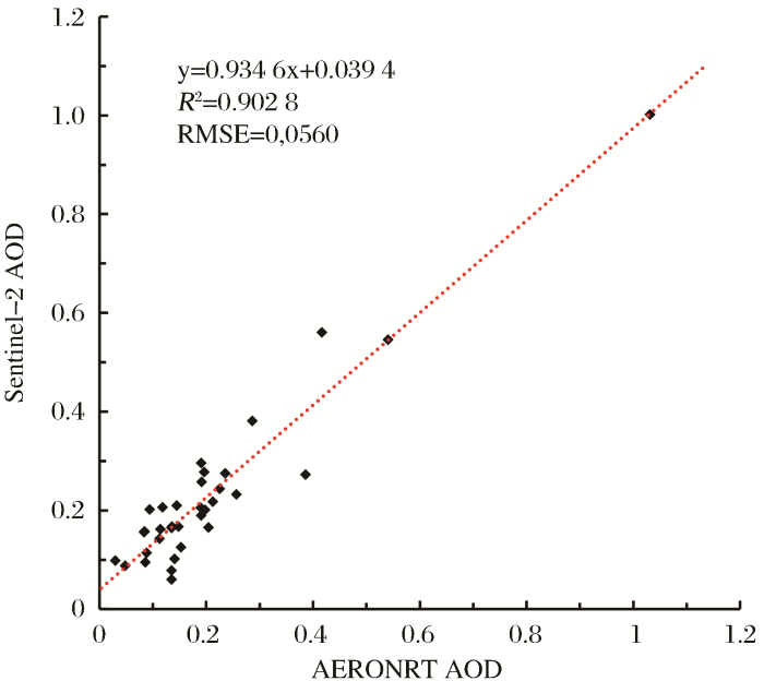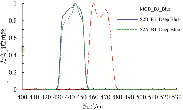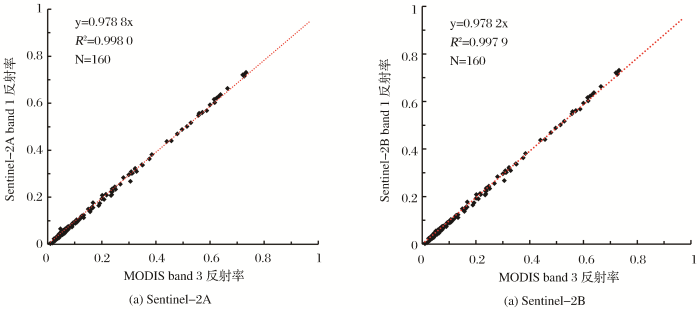 ... 采用MODIS 8 d合成的地表反射率产品构建地表反射率数库.MODIS蓝波段与Sentinel-2A/B深蓝波段的光谱响应函数如图1所示,从图中可以看出,MODIS band 3与Sentinel-2A/B band 1的中心波长、光谱范围、光谱响应值均有较大的差异,由此造成的两传感器对相同地物成像时接收的辐射能量也具有一定的差异.研究表明,0.01的地表反射误差会带来大于0.1的AOD估算误差[33,34,35].因而,在使用MODIS蓝波段反射率之前,需要先经过波段反射率修正将其转换为Sentinel-2深蓝波段的地表反射率.当缺少实测光谱数据时,光谱库在一定程度上可以解决该问题.统计ENVI光谱库中USGS以及ASTER文件夹下的所有地物类别,每类地物选用20条光谱(见表1),重采样到1 nm间隔,分别与MODIS band 3和Sentinel 2A/B band 1的光谱响应函数卷积计算得到地物光谱等效值.由于MODIS band 3和Sentinel 2A/B band 1波宽近似,对两者相应地物的光谱等效值按照进行散点回归分析,如图2,经拟合系数的校正,最终形成与Sentinel-2A/B相匹配的地表反射率库. ...