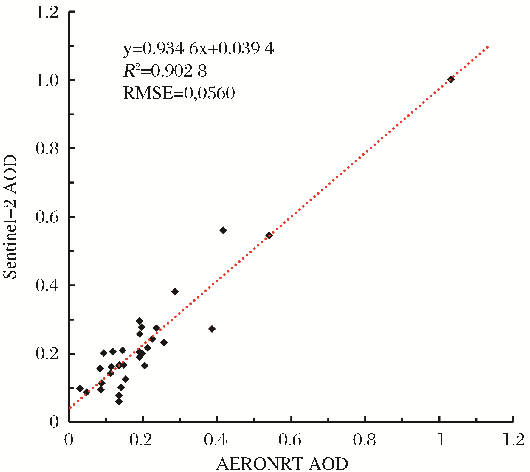 | Fig.4 The Scatter plot of Sentinel-2-derived AOD at 550 against ground-based AERONET AOD |