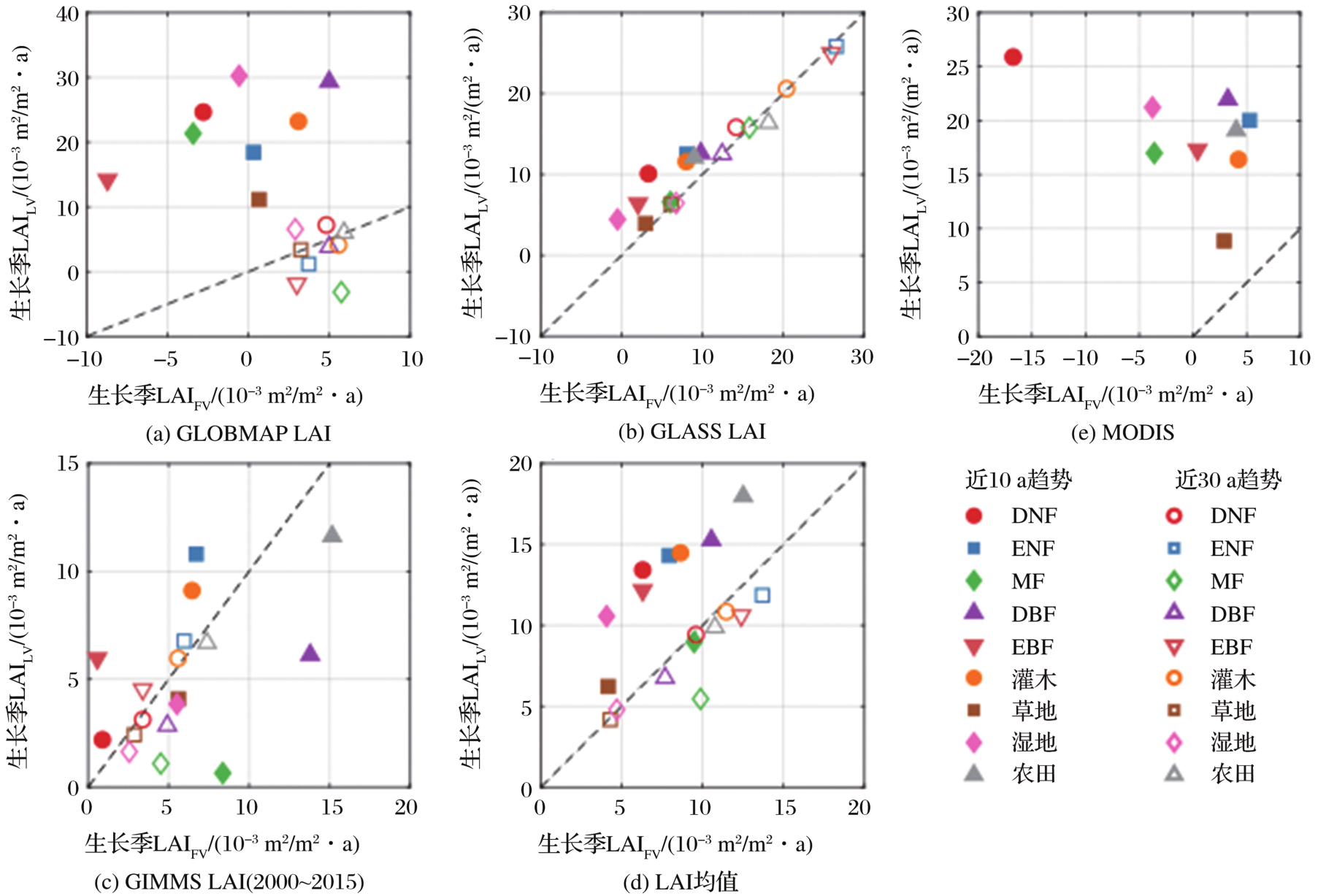 | 图4 近30 a不同植被类型生长季LAI趋势(10-3m2/(m2·year)) |