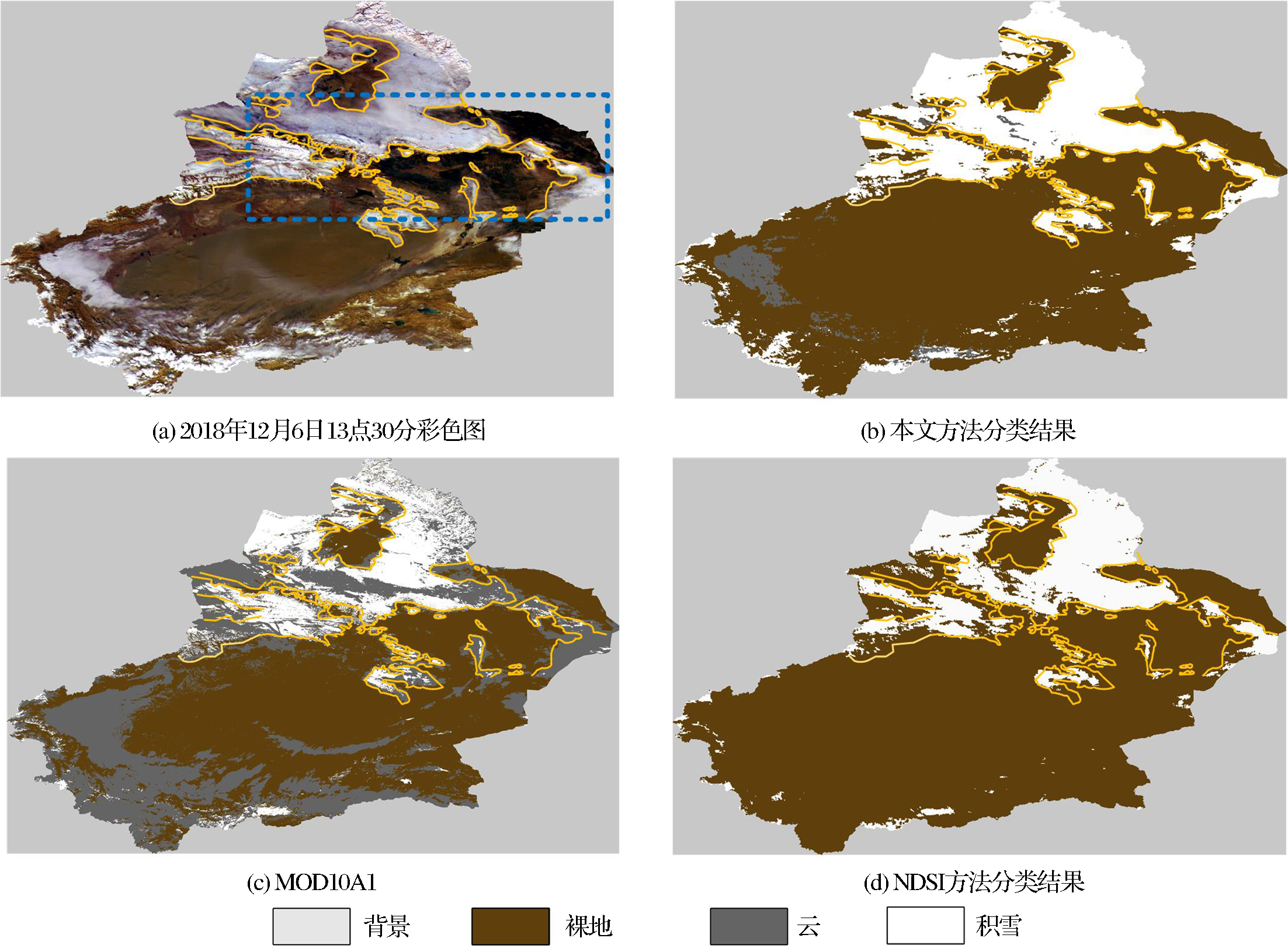 | 图8 新疆2018年12月6日13点45分多种方法积雪提取效果对比 审图号:GS(2016)3333号 |