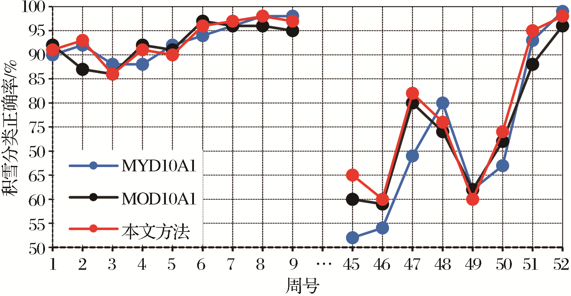 | Fig.10 Accuracy comparison of weekly snow cover over Xinjiang of snow period in 2019 |