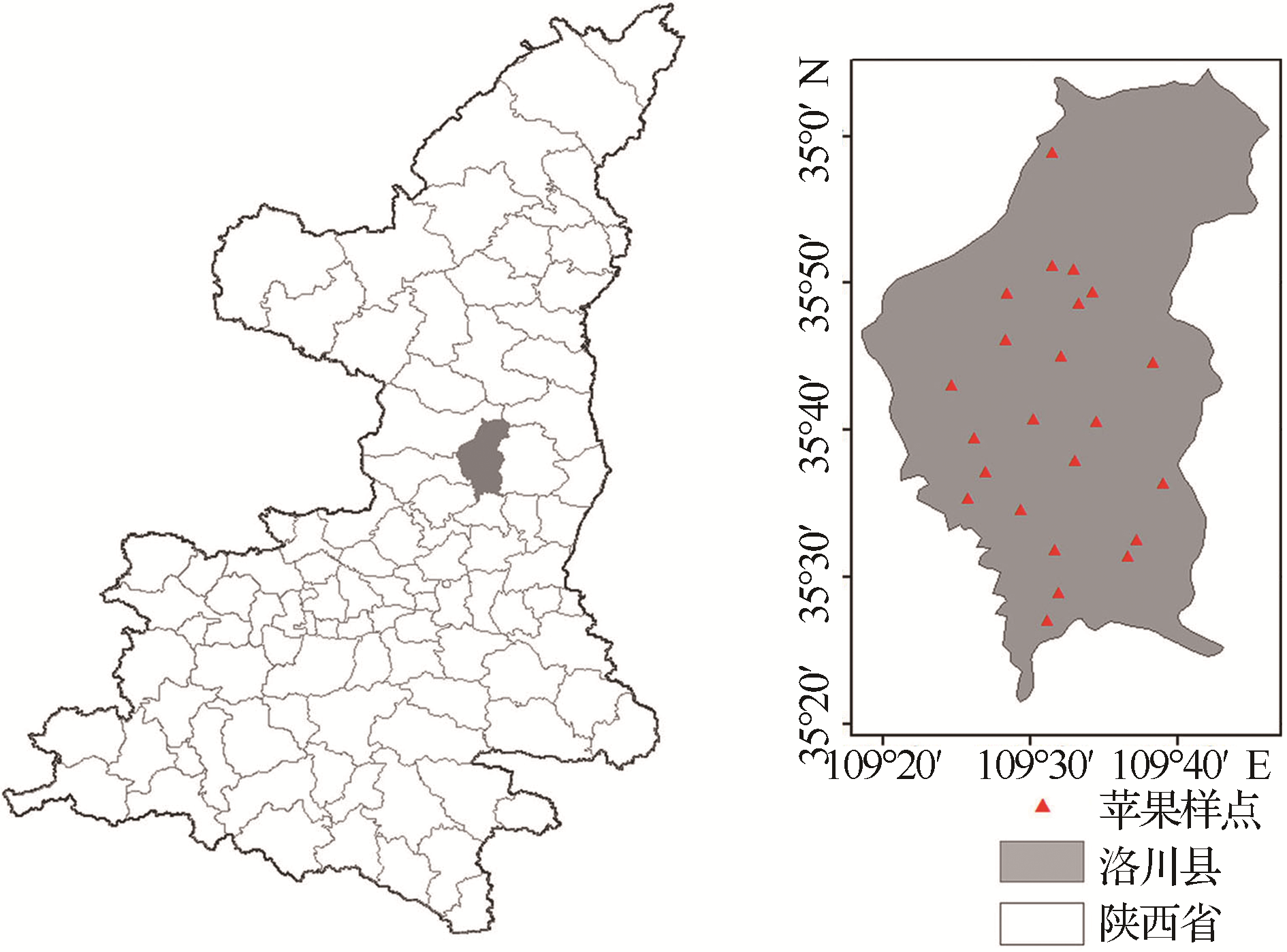 | 图1 洛川县在陕西省的位置及苹果调查样点分布 |