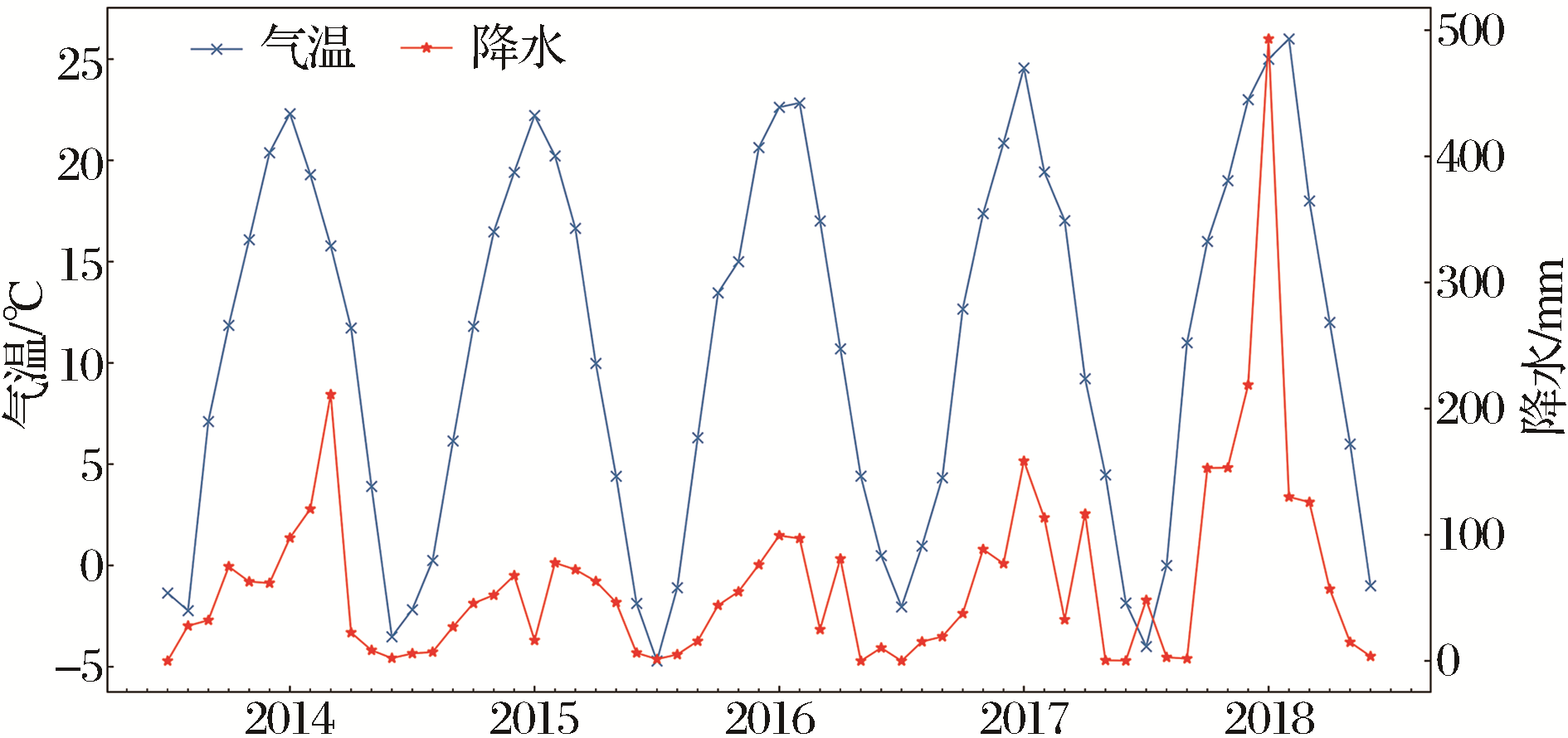 | Fig.5 Temperature and precipitation changes in Luochuan from 2014 to 2018 |
