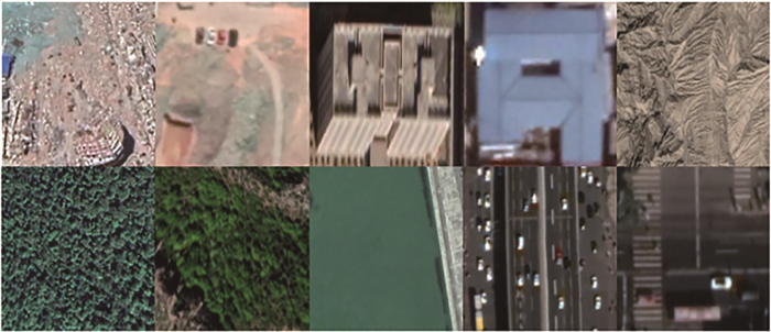 在识别选择建筑垃圾样本过程中,根据部分已知垃圾堆放点的分布位置与影像特征[22 ] ,可以建立起建筑垃圾堆放点在遥感影像图上的解译标志,主要的特征包括颜色、纹理、形状、尺寸以及地理位置等[10 ] 。另外,由于建筑垃圾本身的时间特性,在样本的选取过程中,还依据Google Earth上的时间轴,通过观测同一地点不同时间的地物特征可确定由房屋拆迁留下的建筑垃圾。研究获取的建筑垃圾、房屋、植被、水体、裸地、道路的遥感影像截图分别为1 375、1 370、1 000、860、775、1 000张。图1 为解译标志库部分训练样本。