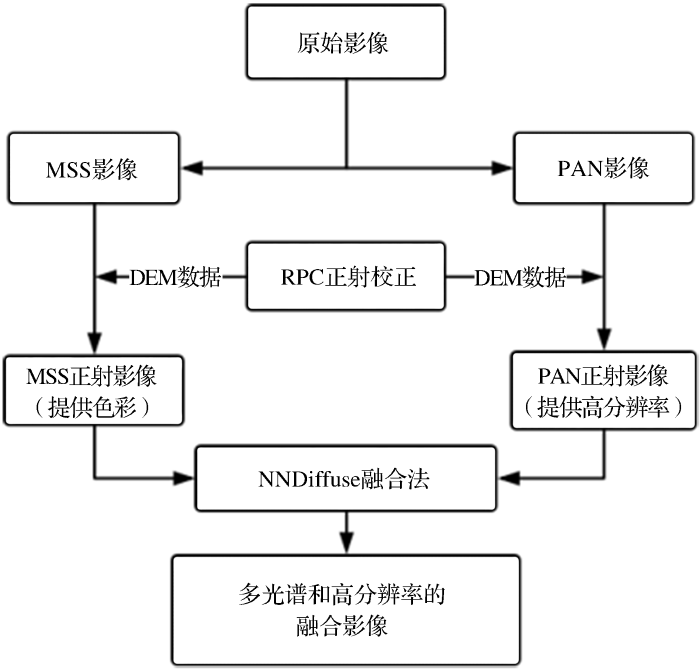融合过程在ENVI5.3中进行,采用NNDiffuse Pan Sharpening算法进行图像融合,此方法得到的结果对于色彩、纹理和光谱信息均能得到很好保留,较其他融合方法更具优越性。最终得到1 m分辨率的多光谱彩色合成影像,输出数据类型为整型,以利于对建筑垃圾的识别和相关信息的提取。融合过程如图3 所示。