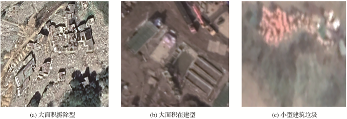 ... 研究将地物分为两大类:正样本建筑垃圾和负样本典型地物,其中典型地物包括房屋、植被、水体、裸地、道路5类.由于Inception-V3模型在进行迁移学习时必须保证一个标签的输入数据仅含有一类地物,而普通全景的遥感影像所包含的地物太过复杂,因此必须通过截图达到提取某一类特定地物的目的.又由于Inception-V3模型对于图片的尺寸有一定的要求,将样本集中的图片尺寸大致统一为了224×224像素.同时,为了保证迁移学习后识别模型的精度,训练数据要尽可能多,并且同一类别的地物应该尽量包含该地物所具有的所有的不同特征[23 ] .图4 为建筑垃圾样本类型示例,其中图4 (a)属于大面积的拆除建筑垃圾,图4 (b)属于大面积的在建过程中产生的建筑垃圾,图4 (c)则属于小型的建筑垃圾. ...