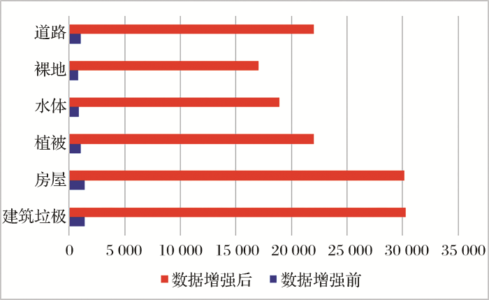 研究主要采用的数据增强方法是尺度和角度的变换,在建筑垃圾和典型地物遥感影像截图的基础上,对建筑垃圾、植被、水体、房屋、道路、裸地6类地物分别进行了7次角度变换(旋转45o 、90 o 、135 o 、180 o 、225 o 、270 o 和315 o )和3次尺度变换(0.5、1、2倍),最终得到了每一类地物在原始数据量的基础上增强了21倍后的结果,数据量对比如图5 所示。从图6 可以看出数据增强大大提高了样本库中各类地物形态的多样性。