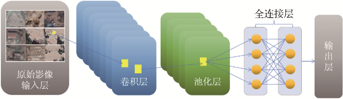 1989年,Lecun等结合反向传播算法首次架构了卷积神经网络结构,并将CNN用以手写体数字的识别,证明了深层神经网络应用于图像识别的可行性[16 ] 。之后随着卷积神经网络的蓬勃发展,深度学习的应用领域愈加广泛,许多学者在将深度学习应用到遥感影像识别和分类领域做出了许多有益探索,与传统分类方法相比,取得了很好的分类效果。Rebecca等[17 ] 将随机森林算法与哨兵二号的遥感影像结合用于澳大利亚东南部不同火灾严重等级的识别分类,并绘制成图,其中对于未燃尽和极端严重等级火灾(全冠消耗量)的识别准确率高达95%以上,郑宗生等[18 ] 利用多景台云图数据构建了台风云图训练集和测试集,并基于迁移学习训练出了台风预报模型T-typCNNs,验证精度可达91.134%。王鑫等[19 ] 提出一种改进的基于深度学习的高分辨率遥感图像分类算法,通过设计的7层CNN获取影像特征,并设计了一种逻辑分类器对图像进行分类。经测试,与传统基于深度学习的遥感图像分类方法相比,其准确率提高了8.66%,但算法效率仍需提高。Huang等[20 ] 提出一种基于深度反卷积神经网络(Deponvnet)的有监督建筑物提取方法。首先创建一个高质量的建筑物数据集,然后在一个公共的大型建筑数据集上预演一个深度反卷积网络,之后对模型的输出进行精细调整。在建筑数据集上的大量实验证明了所提出的方法具备有效性。但是,在预训练深度反卷积网络模型时,耗时较长[21 ] 。