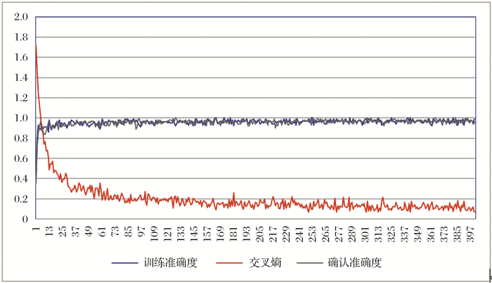 每训练10次,脚本将会输出训练准确度(training accuracy)、确认准确度(validation accuracy)和交叉熵(cross entropy),脚本会根据这3个结果对bottleneck关键参数在识别中所占的权重进行调整,从图8 可以看出,随着训练次数的增多,训练准确度和确认准确度在不断提高,在训练了130次后二者都趋于稳定并不断逼近1,交叉熵随着训练次数的增多逐渐降低,在训练了1 570次后稳定在0.16附近。