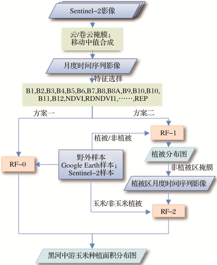... 研究构建两种不同基于随机森林算法的玉米种植面积提取方案,具体技术路线如图2 所示.方案一,直接提取法,即基于多时相影像和3类样本(玉米、非玉米植被、非植被)构建RF分类模型(简称为RF-0),直接提取研究区玉米种植面积.方案二,两步提取法,首先基于多时相S2影像和训练样本,构建提取植被区的RF分类模型(简称为RF-1),得到植被区月度时间序列影像;然后,基于植被区月度时间序列影像和玉米/非玉米植被样本,构建提取玉米种植面积的RF分类模型(简称为RF-2).方案一是目前农作物分类提取中常用的方法[17 ] ,方案二将植被区独立后再对玉米种植面积进行提取.本文旨在通过比较两种方案得出适合于黑河中游玉米种植面积提取的方法. ...