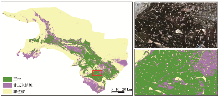 研究区玉米种植面积分布图(左图)以及局部放大Sentinel-2 RGB影像(右上)与分类结果比较(右下)