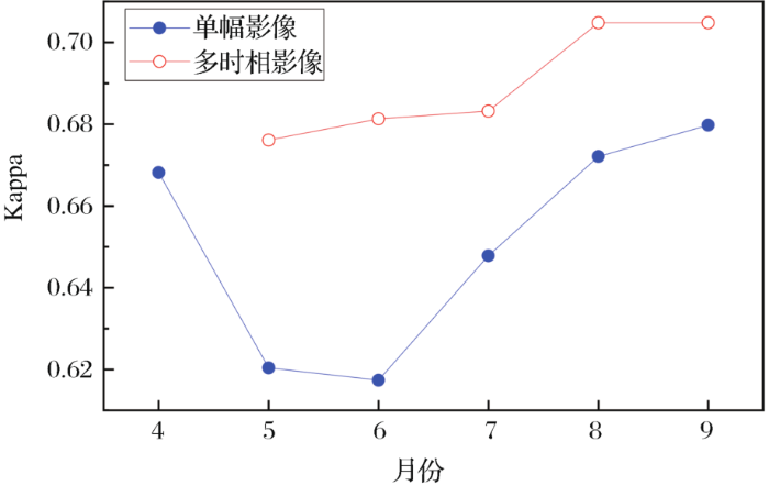 进一步采用增量式学习方法[26 ] 分析多期月中值合成影像数据对分类准确性的影响。该方法在数据子集上训练初始模型,随后不断加入新的数据更新该模型。首先以4月中值合成影像作为数据子集训练初始模型,并对模型进行验证,计算得出玉米的Kappa;然后在此基础上加入5月份中值合成影像再次训练模型,并再次计算此模型分类中玉米的Kappa。以此类推,不断加入新的数据直到新数据为9月份中值合成影像。基于单幅影像和多时相影像分类得到的总体分类精度如图4 所示。基于单幅影像的分类中,4、5月和8月的玉米提取Kappa较高。在4月和5月该地区农田上基本压了薄膜,这些压薄膜的区域基本上种植玉米,因此玉米提取精度较高,但是由于薄膜和大棚信号很相似,导致大棚也被识别为玉米;在8月份,玉米处于抽穗期,生长旺盛,光谱特征与其它地物差异明显,因此提取精度较高。而6、7、9月精度较低,可能是由于6、7月份植被覆盖度整体较低,不同作物间光谱差异较小,存在同物异谱/异物同谱现象;9月部分成熟农作物被收割,导致不同作物间植被指数或波段值差异减小,玉米种植面积提取精度稍有下降。