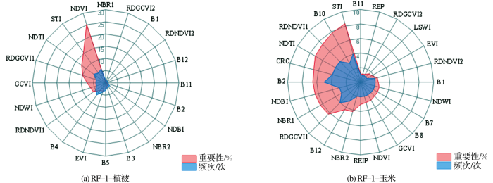 随机森林算法中共使用了180个变量,这些变量在分类过程中的重要性各不相同。对RF-1和RF-2模型中180个变量进行特征重要性降序排序,并对排名前60变量统计其对应指数的重要性以及出现的频次(图5 )。RF-1模型中排名前4的指数是NDVI、STI、NDTI、RDGCVI1(Red edge Green Chlorophyll Vegetation Index 1,红边叶绿素指数1),这4个指数与B4、B5、B8、B11、B12波段相关,这些波段均可有效监测植被生长信息。其中NDVI指数排在第一位且重要性远高于其他指数或波段,说明研究区植被提取在很大程度上依赖于NDVI。与RF-1模型特征参数重要性排序相比,RF-2模型使用指数量明显增多,这是由黑河中游复杂异质性植被结构决定的,其中排名前4的指数为STI、B10、NDT I、RDNDVI1(Red Edge Normalized Difference Vegetation Index 1,红边归一化植被指数1)。STI、NDTI指数为RF-1和RF-2共有指数,两指数均由B11、B12波段计算所得,表明短波红外波段在植被信息提取中的重要性。另外,值得注意的是,B10波段属于“大气”短波红外波段,具有水汽强吸收特性,该波段对本研究中玉米识别具有重要作用,这可能与玉米是研究区蒸散量最大的农作物相关。