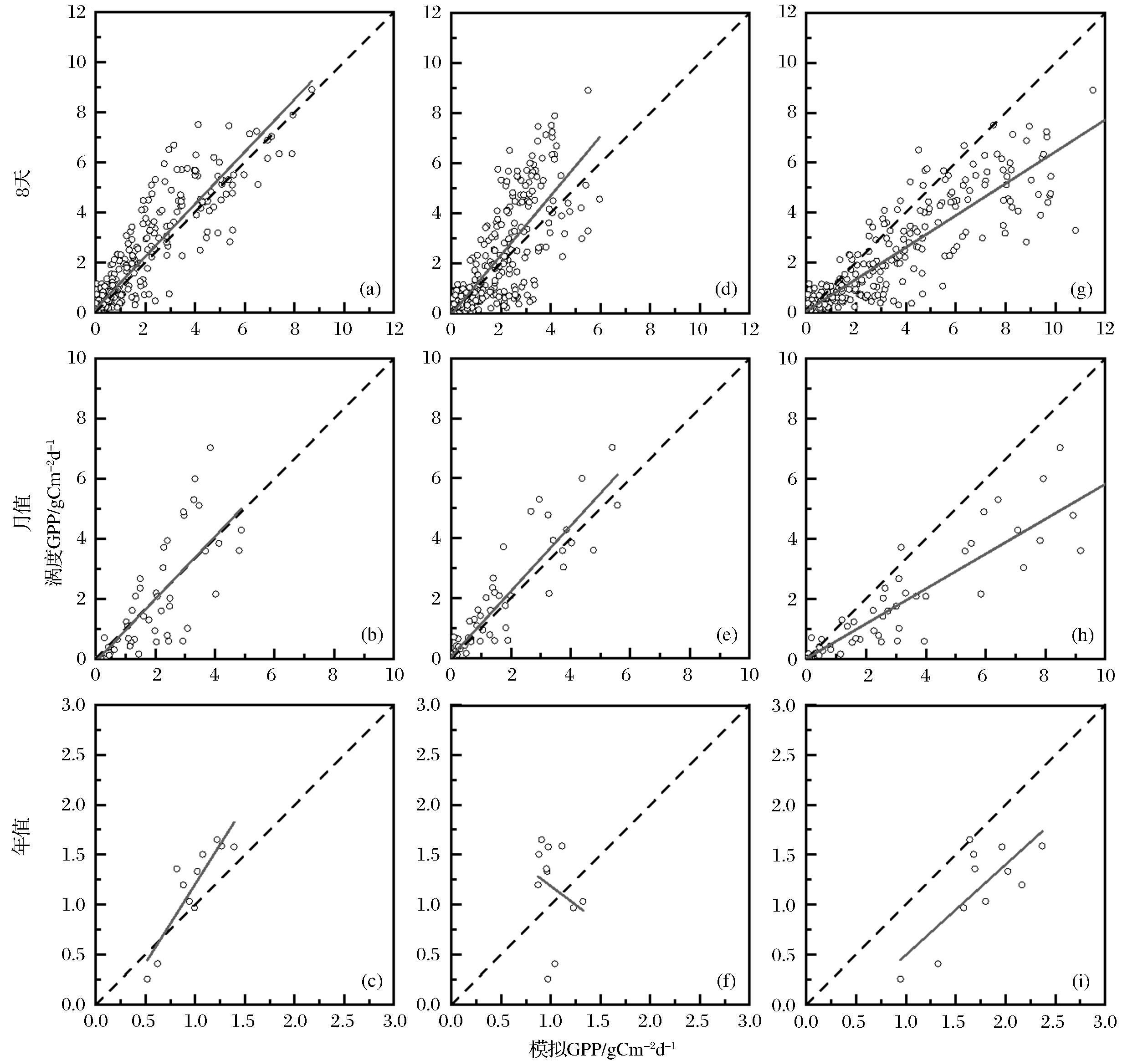 | 图7 GPP产品多时间尺度验证散点图:(a-c)为东北草地光能利用率模型,(d-f)为MODIS GPP产品,(g-i)为VPM GPP产品 |