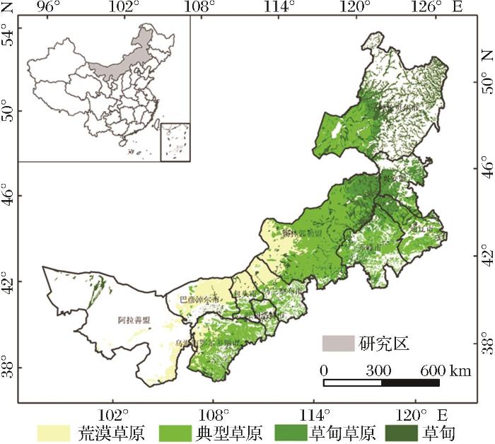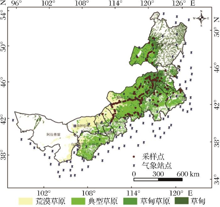 内蒙古草原(37.4°~53.38° N,97.2°~126.07° E)地处我国北部,地域辽阔,东西长达2 400 km,是欧亚大陆斯太普草原的组成部分,有着中国最佳的天然牧场之一,是我国北方重要的生态安全屏障,对维护京津乃至整个华北地区的生态安全都具有重要作用[21]。大部分区域属大陆性季风气候,年均温0~8 ℃,由大兴安岭向东南、西南方向递减;年降水在50~450 mm,自东向西递减;地势由南向北逐渐倾斜。从东到西依次分布着著名的呼伦贝尔草原、锡林郭勒草原、科尔沁草原、乌兰察布草原和鄂尔多斯草原,受水热条件为主的综合因素的控制,内蒙古草原的水平地带性比较明显,由草甸草原过渡到荒漠草原。草甸草原集中分布在大兴安岭东西两侧的低山丘陵地带,以中旱生或广旱生的多年生草本植物为建群种;典型草原是此区天然草原的主体,分布范围最广;荒漠草原分布在锡林郭勒高原西北部、乌兰察布高原和巴彦淖尔高原北部、鄂尔多高原中西部;草甸为隐域性植被,与森林同带,沿河、湖分布。