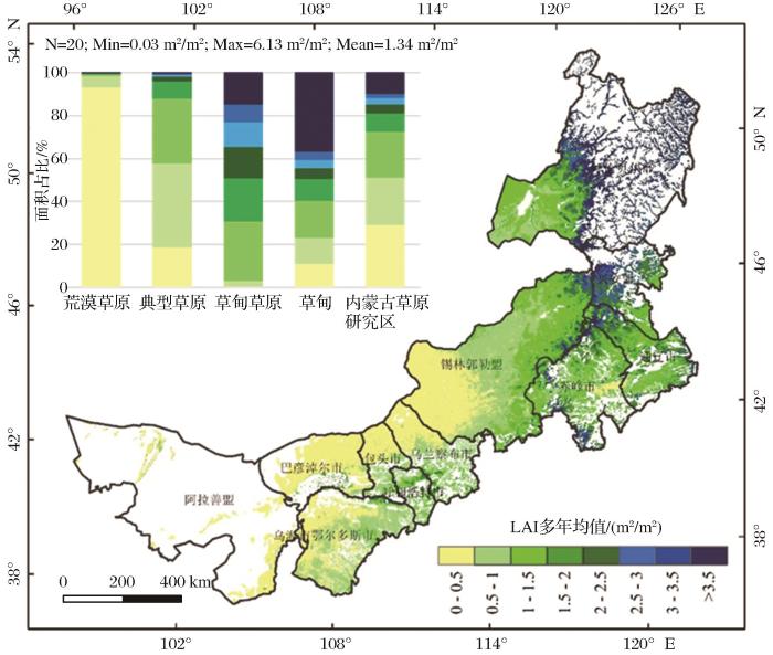 内蒙古草原整体及不同草原类型LAI多年均值空间分布及面积统计
