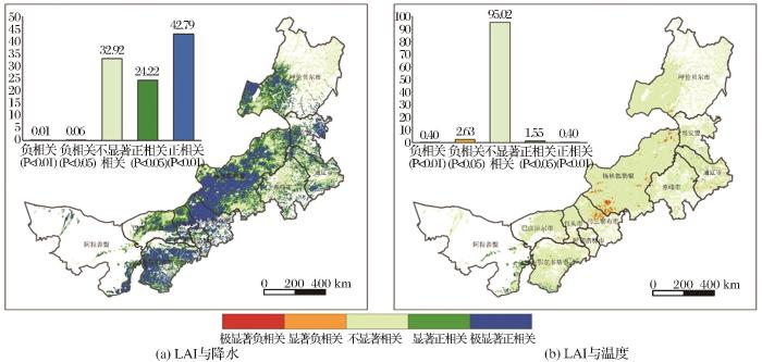 基于像元计算LAI与年降水和年均温之间的皮尔逊相关性系数,探讨水热因子对LAI的影响,根据相关系数的大小,依照显著性检验结果,将相关性关系划分为不显著相关,显著相关,极显著相关三级。