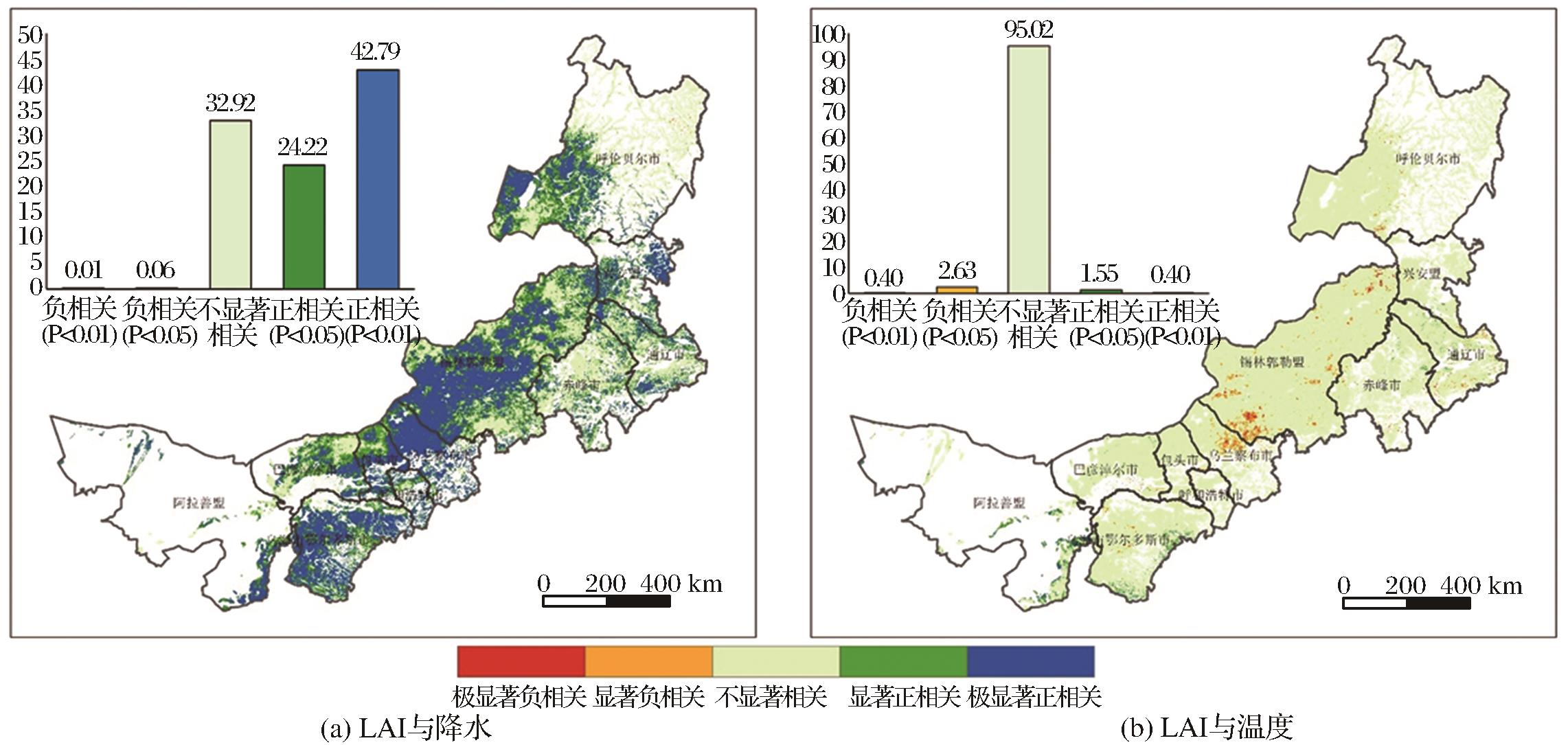 | Fig.7 Correlation between LAI and precipitation and LAI and temperature in Inner Mongolia grassland |