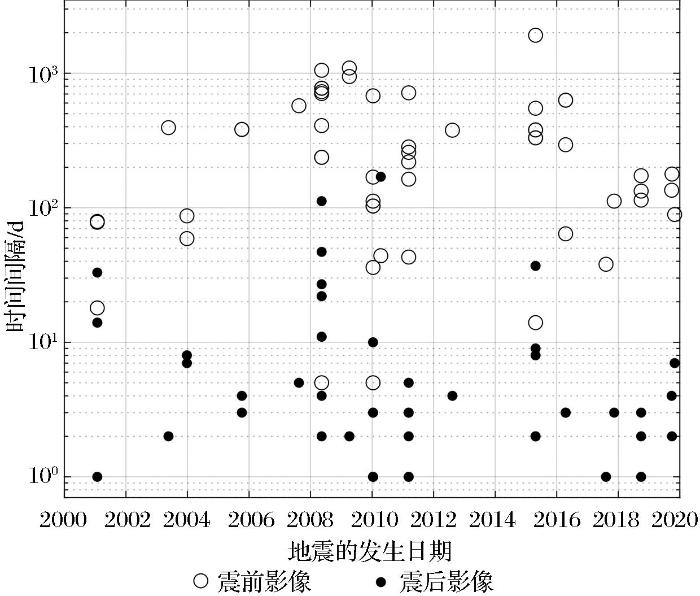 进行变化检测时,震前和震后的影像是必须的,且时效性尤为关键。研究统计了相关文献所采用的数据的获取时间,同时搜集了CHARTER机制响应地震灾害而生成的光学影像产品,统计了这些数据的获取时间,如图1 所示,图中横坐标表示地震发生的日期,纵坐标表示震前或震后影像获取时间相对于地震发生时间所间隔的天数。可以看出,绝大多数震后影像都能在1~3 d内获取,基本上可以满足地震应急的时效性需求;震前数据则相对久远,多为一年以前的,期间地表覆盖可能发生了变化(如植被的生长更替、建筑物的拆迁和新建等),不利于震后的变化检测。因此,应对地震危险度高的城市定期观测和更新本地的遥感影像。总体上,震后数据获取的快慢随发震日期的推移并无明显变化,可能与具体的区域、地震的影响程度等因素有关。