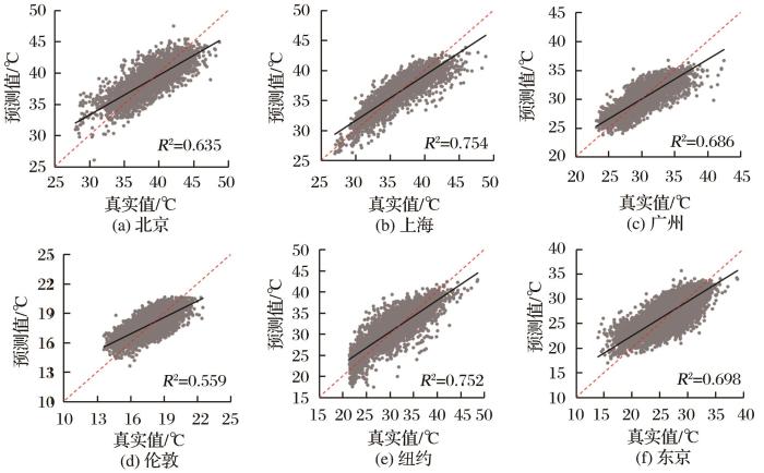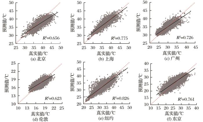 基于3种土地覆盖比例指数和随机森林回归模型、多元线性回归模型分别对中外6个超大城市的地表温度进行反演,得到基于RF方法的土地覆盖类型与地表温度的回归模型(LCT_RF)和基于MLR方法的回归模型(LCT_MLR)。LCT_RF模型和LCT_ MLR模型都使用了中心像元的植被比例(NDVI)、水体比例(MNDWI)和不透水面比例(NDISI)作为模型输入自变量,且这3 个自变量都通过了1%的显著性检验,说明3 个变量都是影响地表温度的重要因子。模型获得的预测LST与遥感数据反演的LST进行精度检验,计算了R2和RMSE 2个统计指标来评价模型的精度(表2)。图5~6分别为LCT_RF和LCT_MLR模型的1∶1散点图。