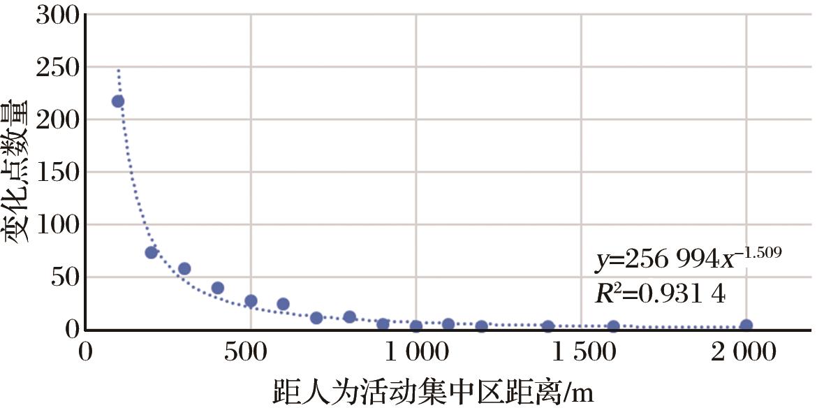 | Fig.5 Distance and quantity relationship curve between the felling points of public welfare forests and the areas where human activities are concentrated |