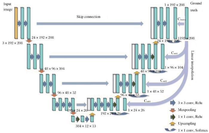 ... Wu等[22 ] 对U-Net网络的损失函数进行了改进,提出了多约束的网络结构MCFCN(Multi-Constraint Fully Convolutional Networks),如图2 所示.该结构不仅考虑解码阶段最后一层的损失,还考虑了中间层与其对应的不同尺度ground truth间的损失,损失函数如公式(1) 和(2)所示,其中C m a i n 表示最后一层输出与ground truth之间的损失,C s u b x ( x = 1,2 , 3 ) 表示解码阶段中间层x 和ground truth下采样1 / 2 x 大小之间的损失,α 、β 、γ 和δ 分别为各层约束的权重,并且α +β +γ +δ = 1 . W k 、H k 为图像的宽和高,g k i , j 为该处像素的预测值,y i , j 为该处像素的真实值.下采样的ground truth使用双线性插值得到,C m a i n 和C s u b x 使用交叉熵损失函数计算. ...