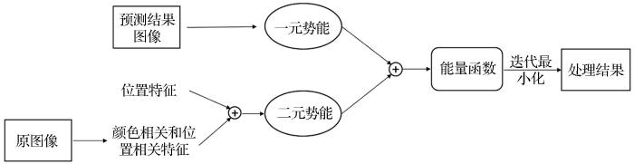 使用全连接CRF对结果做后处理的流程如图3 所示,其中一元势能来自模型的预测结果,二元势能中颜色及位置相关信息来自原图像,由高斯核函数创建与颜色无关的位置特征,最后通过迭代最小化能量函数得到处理结果。
