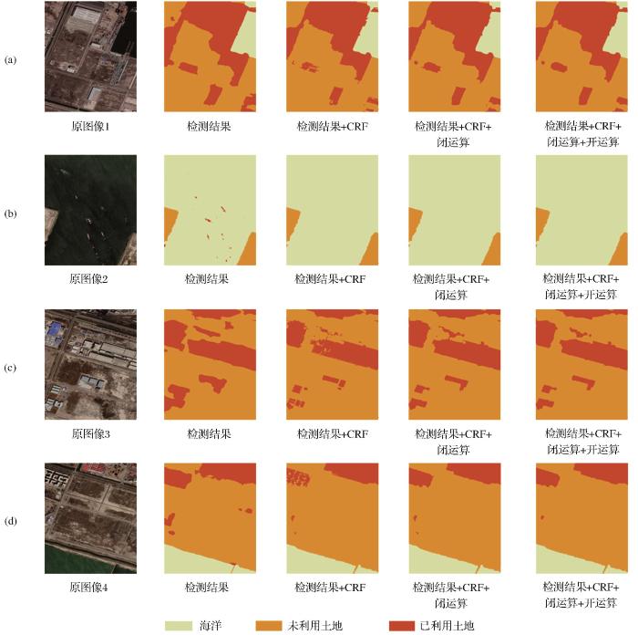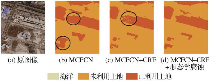 图8 为后处理对比结果,使用全连接CRF对结果进行修正可以解决预测结果边界模糊的问题,还可以起到纠正错误分类的作用,如图8 (b)纠正了海洋中被错误分类的船只。使用形态学腐蚀处理优化全连接CRF的结果起到了填充孔洞和去除噪声的作用。