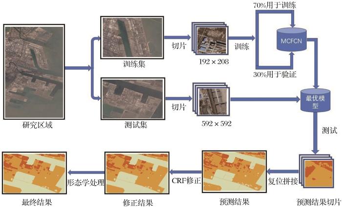 将研究区域分为训练集和测试集,对训练集和测试集使用滑动窗口的方法间隔固定的距离裁剪成规则的切片。从训练集中选取30%数据做验证集用于挑选最优训练模型,使用训练得到的最优模型进行测试得到分割结果,将分割结果拼接为完整的测试区域。对结果实施全连接CRF平滑和形态学腐蚀后处理得到最终结果。
