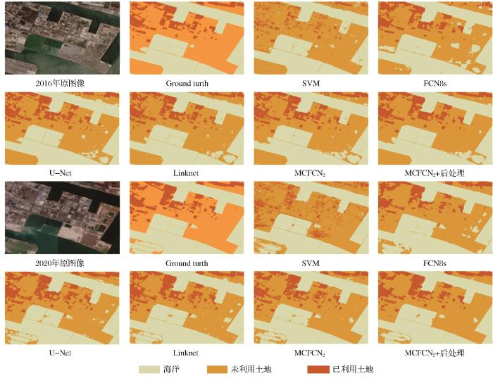 使用2016年和2020年测试区域的遥感影像测试模型,不同模型评估指标对比如表3 所示。其中,FCN8s、U-Net、Linknet的超参数设置与MCFCN2 一致。SVM方法使用ENVI 5.3中的SVM有监督分类实现,核函数选取径向基核函数,并使用聚类处理平滑SVM结果。