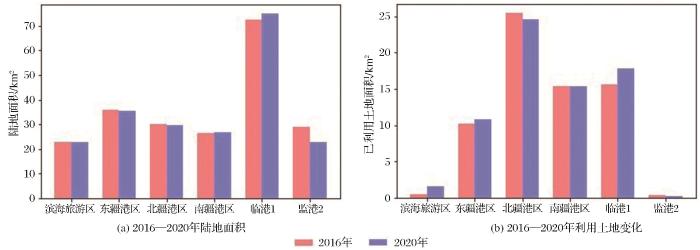 2016年和2020年陆地面积对比如图10 (a),可知2016年以来天津市滨海新区基本没有围填海活动,2016年和2020年天津市滨海新区各港区土地利用变化如图10 (b)所示。其中,滨海旅游区已利用土地面积增长了1.093 km2 ,相较于其他港区增幅最大,说明该区域虽处于发展的起步阶段,但是发展速度很快,而且新增已利用土地多为居住、旅游用途,可知该区域的建设中心偏向旅游与服务业。东疆港区新增利用土地面积0.553 km2 ,主要来自居民区的扩建。东疆港区已利用土地主要分布于西南沿海,由大型码头和发达的物流业组成,东部沿海地区主要为景区(东疆湾景区)和居民公寓。2020年位于北疆港区新港五号路和新港六号路交会的大型堆场和新港一号路南部堆货码头的遗弃导致了北疆港区已利用土地面积的负增长。南疆港区已利用土地面积基本保持不变。由于北部沿海码头和南部工业区的扩建,临港工业区1已利用土地面积增加了2.17 km2 。临港工业区2利用土地面积很少而且基本没有变化。