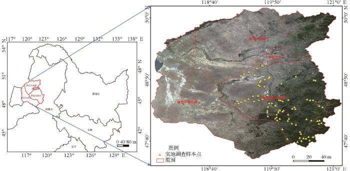 研究区地处内蒙古东北部的呼伦贝尔高原之间,行政区包含海拉尔市、陈巴尔虎旗、新陈巴尔虎左旗、鄂温克族自治旗(47°20′—50°11′N,117°33′—121°09′E;图1 )。研究区东部靠近黑龙江,南部与蒙古国相接壤,西部至呼伦湖东岸,北部与俄罗斯相邻,地势由东向西逐渐降低,南部高于北部[19 ][20 ] 。研究区为大陆性季风气候,年平均气温介于-2.5—0 ℃之间,无霜期为90—100 d。年降水量270—370 mm,年蒸发量1 400—1 900 mm,干燥度为1.2—1.5,相对湿度为60%至70%[21 -22 ] 。森林为针叶林、阔叶林和针阔混交林,树种以樟子松、落叶松(Larix gmelinii )、白桦(Betula platyphylla )、山杨(Populus davidiana )等;灌草丛以冷蒿(Artemisia frigida Willd )、差巴嘎蒿(Artemisia halodendron Turcz.et Bess )、小叶锦鸡儿(Caragana microphylia Lam )、黄柳(Salix gordejevii Chang et SkV )、榆树(Ulmus Bergmanniana Schneid )为主;草原以线叶菊(Filifolium sibiricum )、贝加尔针茅(Stipa grandis )、羊草(Leymus chinensis )、大针茅(Stipa grandis )、克氏针茅(Stipa krylovii )、隐子草(Gramineae sp )为主[23 -25 ] 。农作物主要有大豆、玉米、大麦、小麦、油菜、蔬菜等,为一年一熟[26 ] 。作为呼伦贝尔重要的生态功能保护区和生态敏感的林草过渡带之一[6 ] ,由于长期不合理开发利用,呼伦贝尔沙地植被退化和土地沙化现象严重。