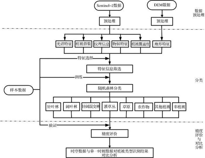 研究首先进行分类体系构建,然后基于GEE云平台快速获取了研究区2019年的Sentinel-2A数据和DEM数据,并进行预处理和重采样,在此基础上进行光谱特征、植被指数、纹理信息、物候特征、植被覆盖度和地形特征等特征数据集的提取。结合所有样本数据通过RF特征选择法进行特征数据集的选择得到最优特征数据集,作为不同植被类型识别的特征,再利用RF分类方法实现研究区地物类型的识别。最后将时序数据与单一时相数据的植被类型识别结果进行精度评价和对比分析。本文详细技术流程见图2 。