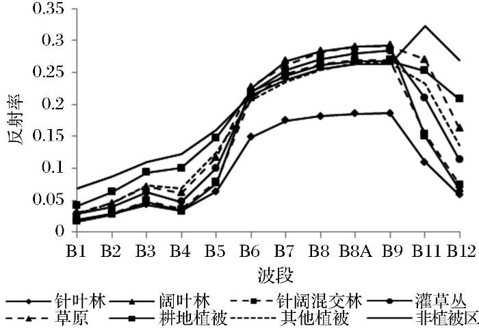 基于不同植被类型的实测样本数据,在影像上提取不同波段的地表反射率,并生成光谱曲线(图3 )。从不同类型植被的光谱曲线(图3 )可以看出,针叶林在B6—B11波段的反射率明显低于其他的植被,易于提取;灌草丛、草原和其他植被除在B12波段的反射率具有一定的可分性外,在其他波段反射率相近可分性较差;农作物在B2—B4波段和B12波段与不同植被类型的反射率差异大,可分性较好;非植被区在B1—B4波段、B11和B12波段的反射率高,便于区分。但阔叶林和针阔混交林二者之间因光谱曲线相近而难以区分。所以,仅通过光谱特征进行研究区植被类型识别,容易因不同类型植被之间的光谱分辨率相近而造成混分。