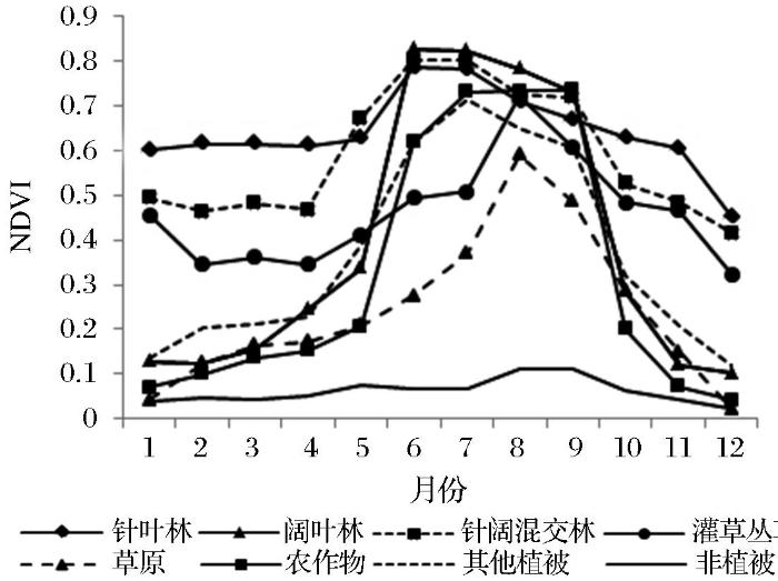 由图4 可知,针叶林在1—5月的NDVI处于平稳状态,但NDVI与其他不同植被类型差异较大,便于针叶林的识别;针阔混交林在1—4月的NDVI波动变化较小,从4月开始上升,与针叶林二者在4—6月的NDVI变化差异较大,便于二者的区分;阔叶林在5月的NDVI急剧上升,上升速度比农作物的快,到6月达到峰值,9月急剧下降,与不同植被类型的NDVI变化差异较大,便于阔叶林的识别;灌草丛的NDVI在1月逐渐下降,到2—4月处于平稳状态,在4月以后缓慢上升,到7月急剧上升,8月达到峰值,然后开始快速下降,与不同类型的植被NDVI变化有较大差异;草原的NDVI从4月开始上升,但上升速度远比其他植被的小,8月达到峰值,之后便开始下降,与灌草丛的差异较大,便于二者的区分;农作物的NDVI从5月开始急剧上升,9月达到峰值,然后急剧下降,与其他植被类型变化差异较大,便于农作物的识别;其他植被的NDVI从4月开始上升,7月达到峰值,然后逐渐下降,到9月急剧下降,与草原和灌草丛的NDVI变化有较大差异,在8月与草原和灌草丛具有一定的可分性;而非植被的NDVI全年波动变化不大,易于区分。因此,从不同植被类型的NDVI变化曲线看,不同植被类型的NDVI变化趋势差异较大,便于识别。其中森林类型内部的针叶林、针阔混交林、阔叶林之间的NDVI变化也较大,便于森林类型的识别,可以有效弥补原始光谱特征对森林类型识别能力的不足,增加不同植被类型之间的可分性。