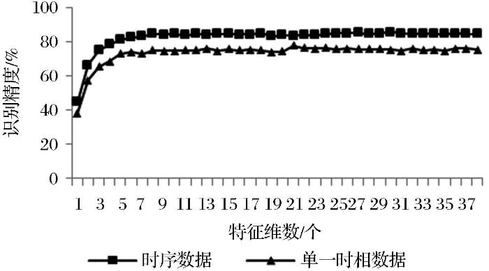 研究采用RF特征选取方法进行不同类型植被的特征信息优选,首先利用RF算法对特征变量的重要性进行排序,然后采用序列前项选择的方法,按特征重要性得分从高到低依次加入模型中训练分类器,通过逐次迭代并计算研究区植被类型识别的正确率。最终得到特征个数最少、分类准确率最高的特征数据集作为研究区植被类型识别的特征数据集[37 ] 。