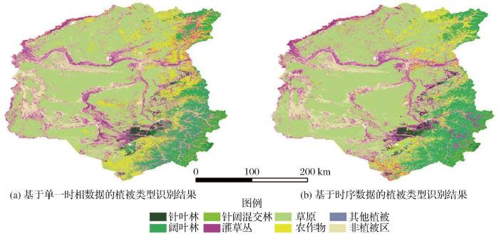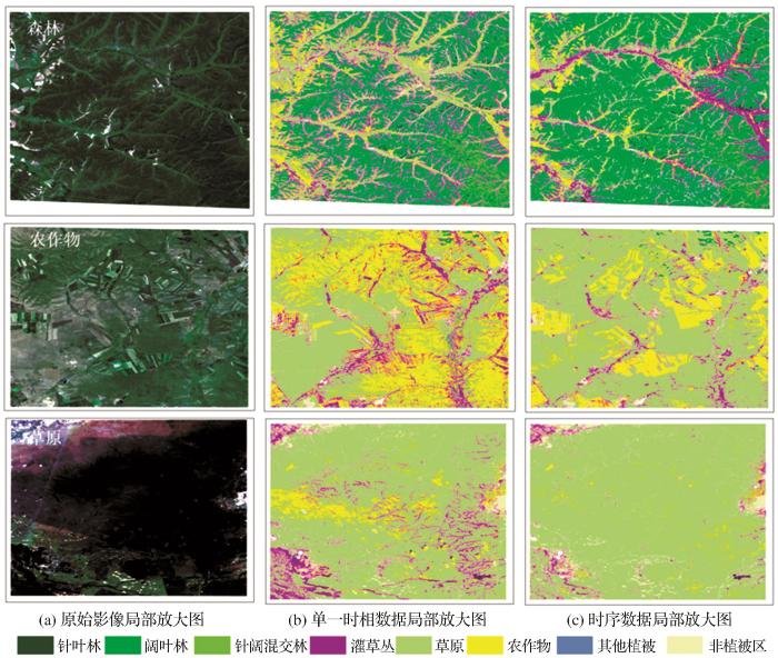 将单一时相数据的不同植被类型识别结果与时序数据的主要植被类型识别结果局部放大(图6 )对比发现:单一时相数据中森林和农作物破碎度严重,边界比较模糊,大部分草原被错分为农作物和灌草丛,而农作物也被错分为草原和灌草丛。相对而言,加入物候信息的时序数据降低了森林和农作物类型识别结果的破碎度,使阔叶林和农作物的边界更加清晰,还减少草原与农作物之间的混分,有效改善了沙地及其周边植被类型的识别效果。