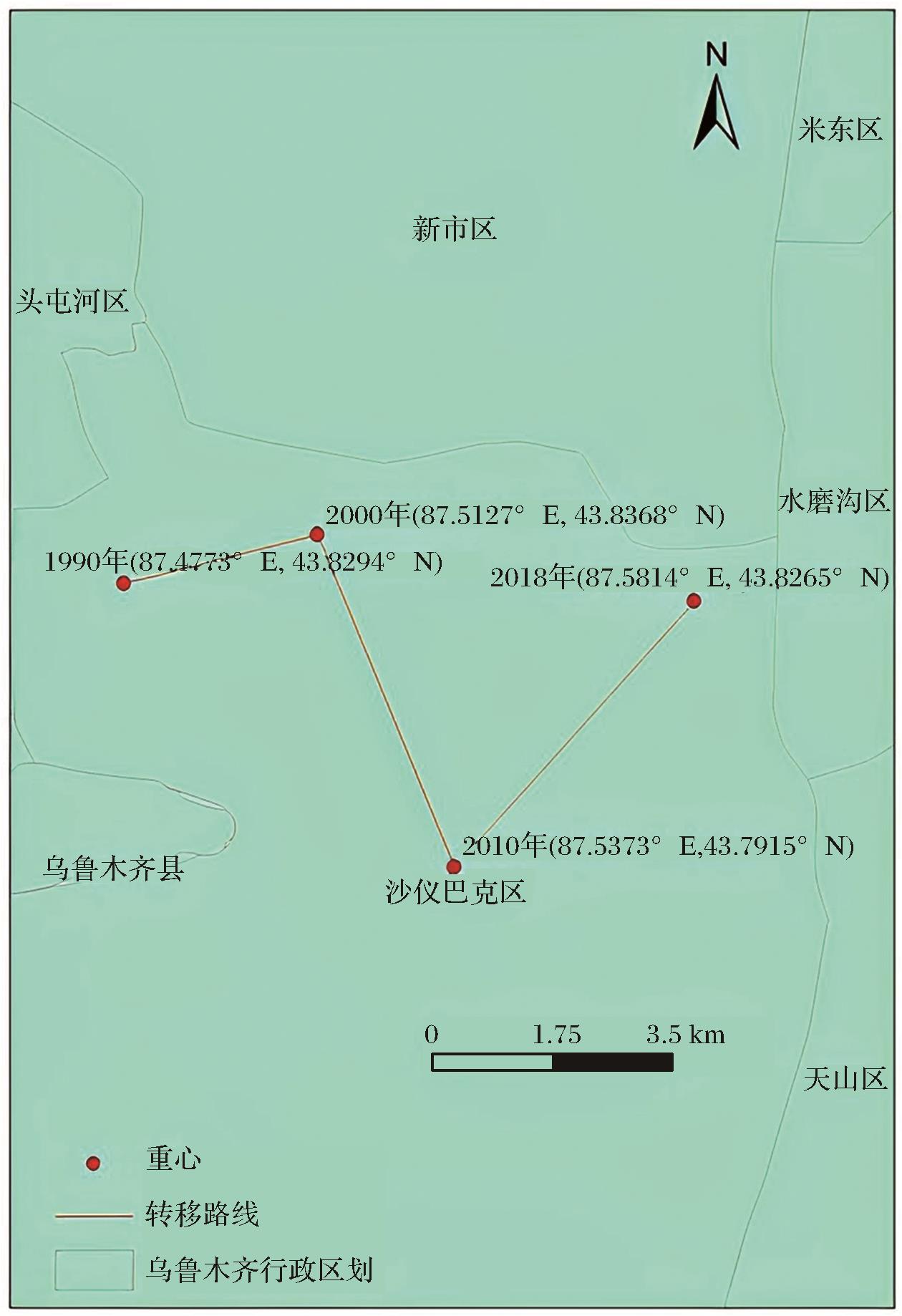 | 图4 1990~2018年乌鲁木齐主城区建设用地重心及其转移路线 |