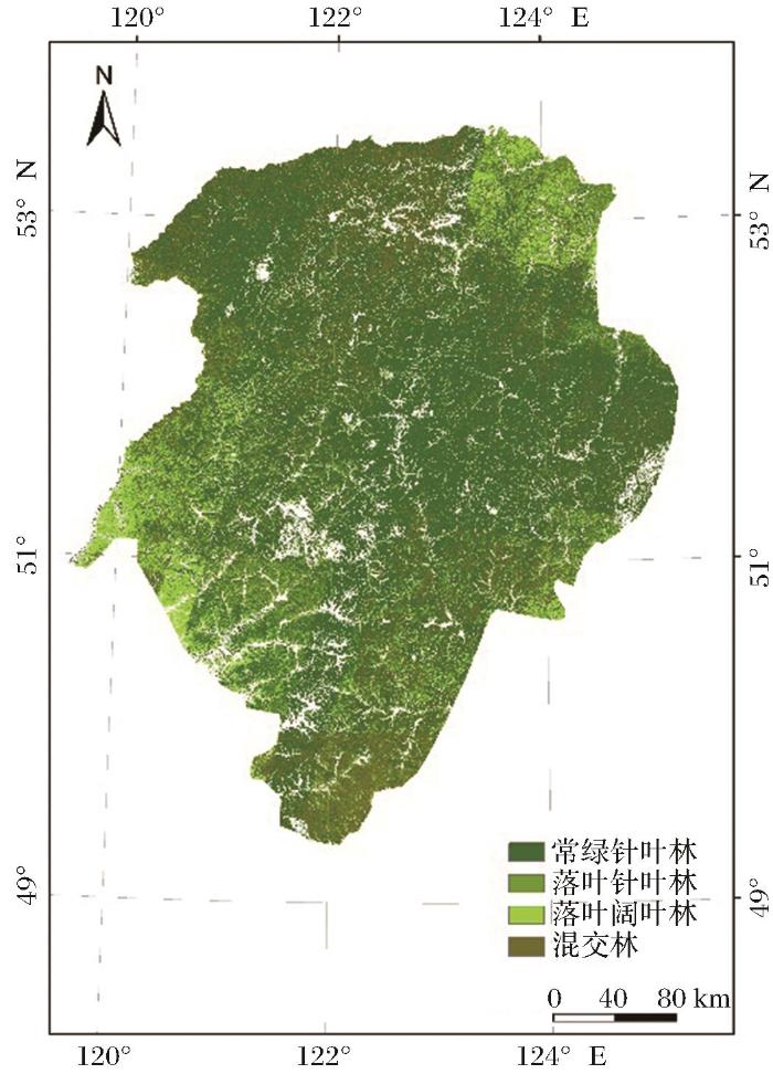 研究所用数据主要包括遥感数据、气象数据以及地面测量数据3个部分。遥感数据使用了清华大学宫鹏教授团队生产的土地覆盖(Land cover)数据集FROM-GLC(Finer Resolution Observation and Monitoring of Global Land Cover)以及本文生产的叶面积指数(Leaf Area Index,LAI)时间序列数据集和光合有效辐射吸收比(Fraction of Absorbed Photosynthetically Active Radiation,FPAR)时序数据集。以上3个数据集的时间分辨率均为8 d,空间分辨率均为30 m。FROM-GLC数据集覆盖全球[25]。研究提取了大兴安岭北段森林的土地覆盖数据(图2),森林面积约为94 799.50 km2。其中,常绿针叶林面积占比最大,为64%;混交林面积占比次之,为21%;落叶阔叶林面积占比8%,落叶针叶林面积占比7%。
