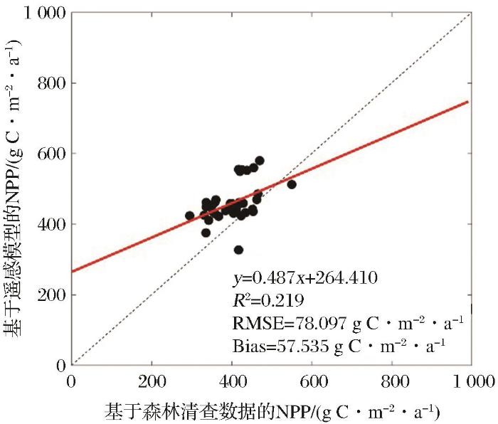 使用森林清查数据估测的NPP验证NPP遥感估算结果,使用均方根误差(RMSE)来描述两者的差异,RMSE计算公式如下: