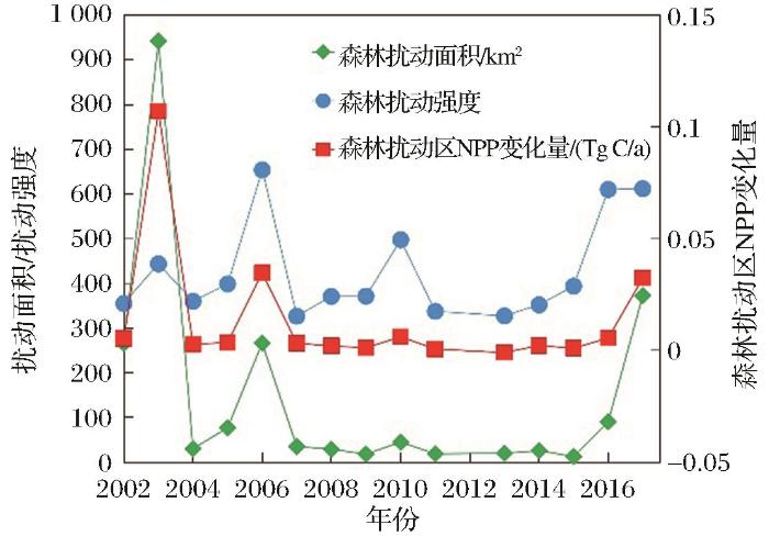 2002~2017年大兴安岭北段森林扰动导致的NPP减少量年平均值为0.01 Tg C /a。其中2003年、2006年和2017年扰动面积和扰动强度均较大,直接导致扰动年NPP分别减少0.11 Tg C,0.03 Tg C和0.03 Tg C,NPP受到森林扰动影响大。2010年与2016年森林扰动强度大但扰动面积小,NPP减少量小。2002年森林扰动面积大但强度小,NPP减少量也较小。面积大且强度大的森林扰动对NPP产生的影响较大。