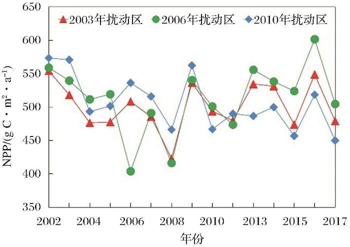 在发生森林扰动时间较早的区域,使用长时间序列数据分析森林扰动强度对生长季NPP产生的持续影响。2003年、2006和2010年森林扰动区生长季NPP均值年际变化如图7所示。从图中可以看出,2003年森林扰动区受到扰动后,NPP持续低于扰动前一年NPP数值,直到2016年才出现高于扰动前一年(2002年)NPP的情况。2010年森林扰动区受到扰动后,NPP也持续低于扰动前一年NPP数值。然而,2006年森林扰动区受到扰动后,NPP先低于扰动前一年NPP,从2009年就开始出现NPP高于扰动前一年(2005年)NPP的情况,在此之后2013、2016年NPP均高于扰动前一年NPP。2006年比2003年和2010年扰动强度大,但是植被恢复速度最快。从2002~2017年森林扰动强度来看,2003年与2010年森林扰动强度为中低强度,2006年为中高强度。有研究表明中高强度火干扰消灭了上层树木,并允许大量的再生[10],NPP迅速恢复。