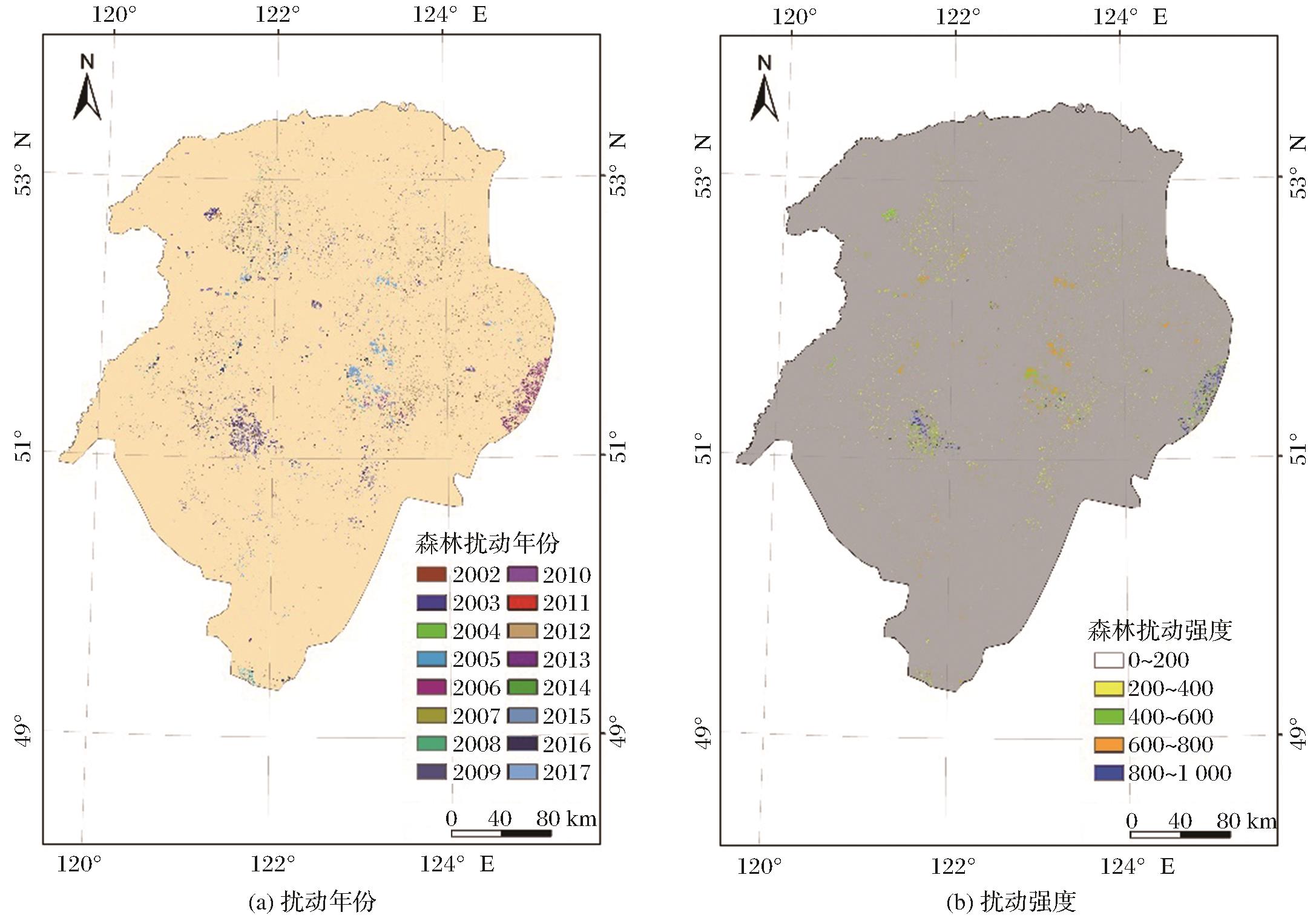 | 图5 2002~2017年大兴安岭北段森林扰动年份及扰动强度空间分布图 |