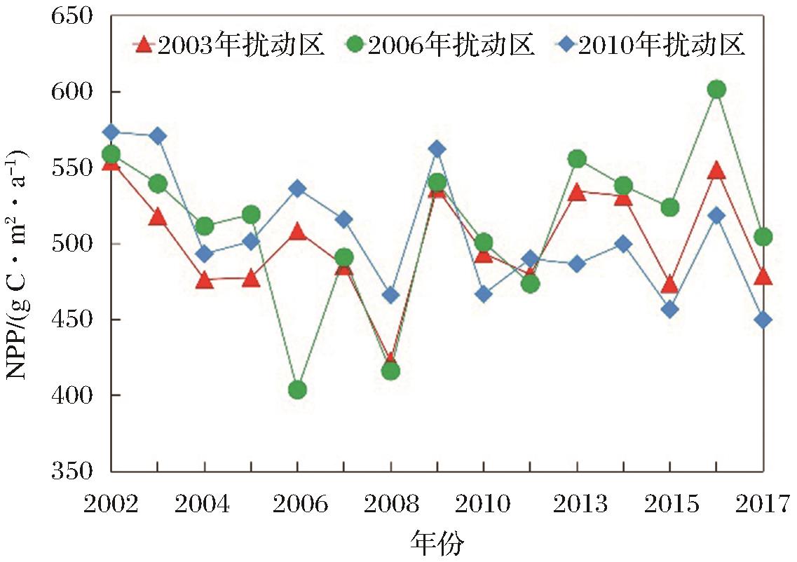 | Fig.7 Interannual variation of NPP in the growth season in the forest disturbed areas |