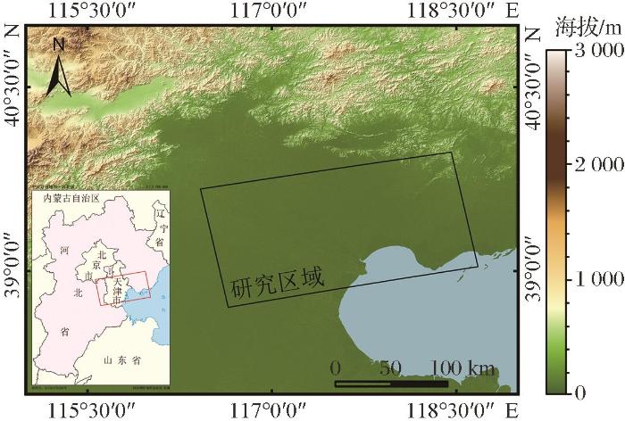 研究区域位置如图2所示,其中红色实线框所示范围为具体的监测区域,面积约19 265.13 km2,包含天津市中心城区及南部大部分区域、唐山市西南部分区域及廊坊市东北部分区域。研究区域自西北向东南呈现丘陵—平原的变化趋势,东南临渤海湾,主要以大面积沉积平原为主。该区位于温带大陆性气候区,降水量少,地表水资源缺乏;近半世纪的农业发展、城镇发展等大量开采地下水、截蓄地表水,致使该地区地下水位持续下降,地面持续下沉。另外,工业城市唐山蕴含丰富的地矿资源,过多的地矿开采致使地面建筑设施及环境遭到了破环。同时,研究区域包含了3座城市的中心城区以及大面积农业区,城市人口持续增多及农业发展对地下水资源及地矿资源的需求增大,使得地面沉降难以控制。严重地面沉降是研究区域安全持续发展的主要威胁。