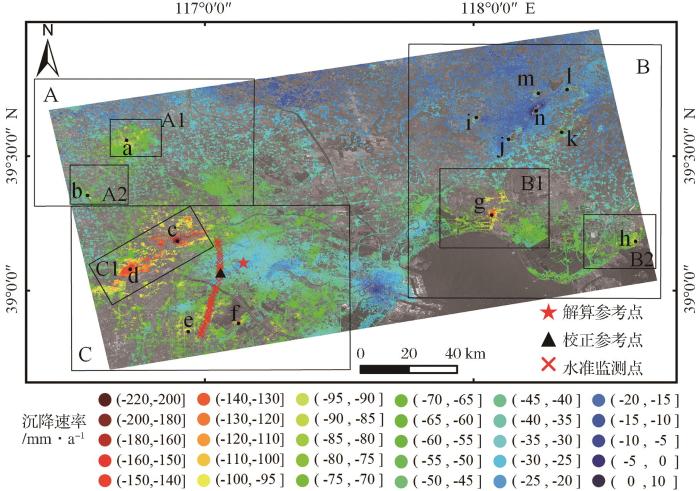 天津市是我国因地下水过量开采导致严重地面沉降的典型区域。结合图4,天津市主城区及北部区域地面相对稳定没有发生显著沉降,主城区(区域C)周边沉降依旧很严重。主城区沉降在35 mm·a-1以下,郊区平均沉降速率超过了55 mm·a-1,最严重沉降出现在区域C1(霸州市胜芳镇至武清区王庆坨镇部分区域)一带,沉降速率在140 mm·a-1以上,王庆坨镇(c点)的最大沉降速率超过了200 mm·a-1。