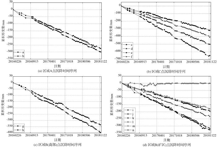 如图4中地表沉降速率分布可知,研究区域地表沉降空间分布不均,总体呈现南部沉降较北部严重。区域A中,主要表现为城市区域沉降较郊区更严重,年均沉降速率在70 mm∙a-1以上。区域B严重沉降主要分布于南部沿海区域,最大沉降速率超过了110 mm∙a-1;北部主城区相对较为稳定,仅部分小面积的沉降发生。区域C沉降最为严重,年均沉降速率都在15 mm∙a-1以上,郊区沉降较城区更严重;沉降最严重区域出现在C1区域,并在点c (天津市王庆坨镇)、d (廊坊市胜芳镇)附近出现了严重沉降漏斗,最大沉降速率达到了218.31 mm∙a-1,3 a累积沉降量达到了643.35 mm。图6所示为沉降区域选取的14个点(a~n)的沉降时间序列。从所选点的沉降时间序列来看,总体上在时间域呈现出以线性形变为主的特征,并存在一定的非线性沉降。