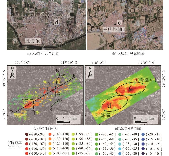 如图9所示为C1区域沉降分布,采用Kriging插值得到该区域沉降场,结合该区域西南-东北向的沉降剖面(图10(a)所示)可知该区域出现了以胜芳镇(d点)以及王庆坨镇(c点)为中心的沉降漏斗,胜芳镇漏斗中心沉降速率为160 mm∙a-1,王庆坨镇漏斗中心沉降速率为218.31 mm∙a-1。结合已有资料及可见光影像发现,该区域都是大面积高密度的农村自建房及工业区,人口密度大,工业生产活动密集,生活和工业用水致使地下水超量开采是导致严重沉降的主要因素[1,5,27]。如图9所示,某高速公路从王庆坨镇沉降中心穿过,提取了其从北至南沿线的沉降速率(如图10(b)所示),沉降分布呈现出严重的不均匀性,最大沉降速率192.66 mm∙a-1,这可能影响高速公路的交通安全。