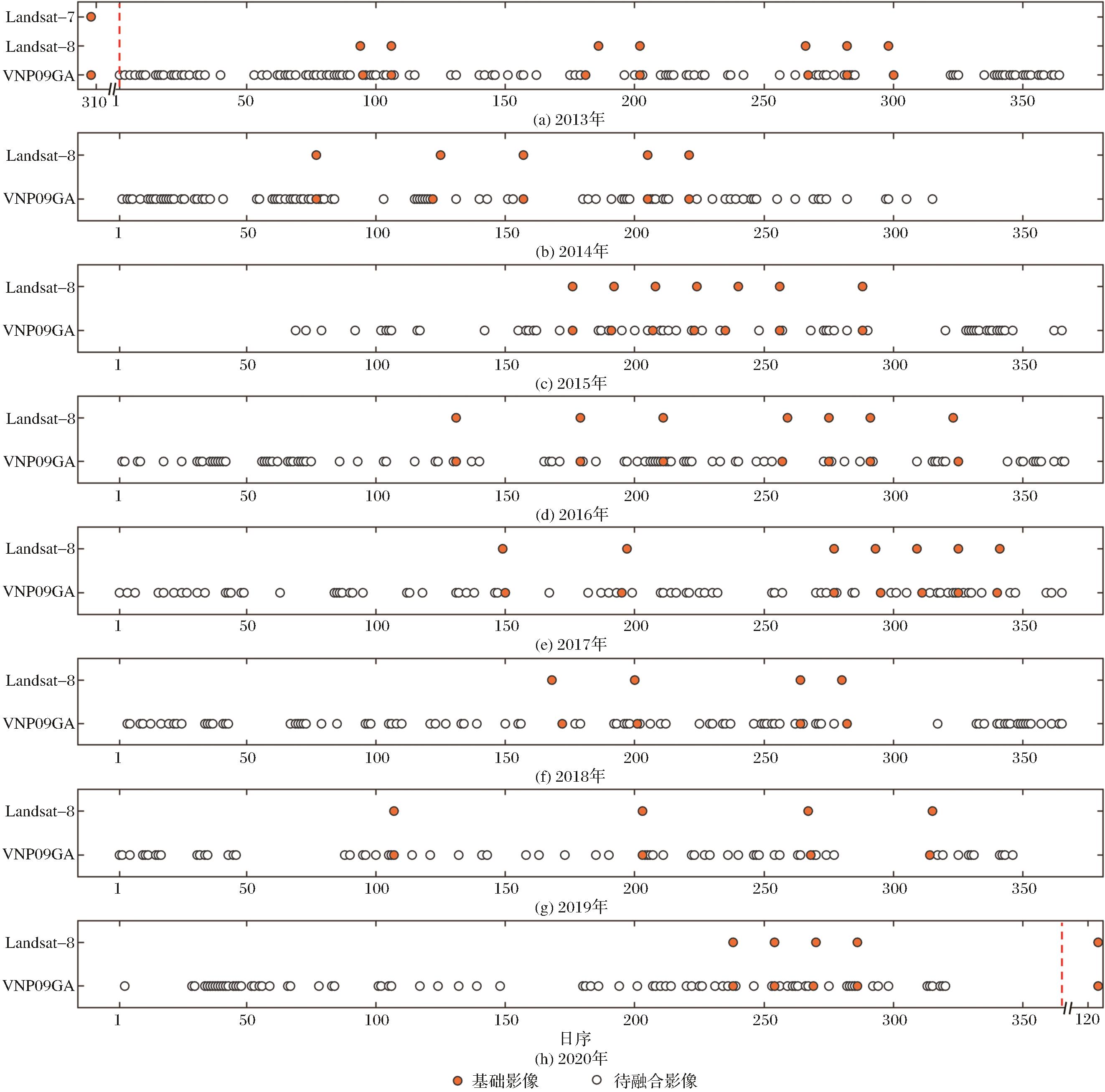图2 输入ESTARFM算法的2013~2020年基础影像对和待融合影像的时序分布示意图 |
